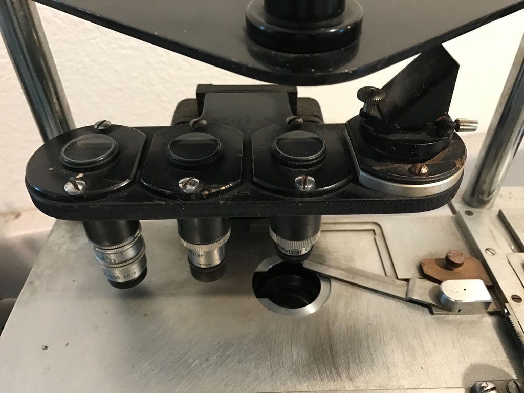 Rare Vintage Leitz Wetzlar XI C Carbon Arc Projection Microscope. 1950s Leitz precision projection microscope all original with three Leitz Wetzlar objectives, x/y adjustable stage, multiple prisms. All adjustment knobs working smoothly. Carbon arc projection assembly in very good condition with carbon rods intact. A similar Leitz XI C is in the Historical Scientific Instruments Collection of the Yale Peabody Museum of Natural History, though Yale's example is missing the central liquid-filled lens assembly which this one has.