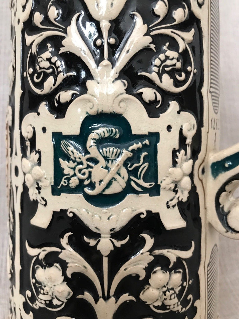 Antique 2L German Beer Stein 1282 J c.1880s HB. Beautiful detailing throughout in dark blue, teal blue and brown. Marked 2L and 1282 J.