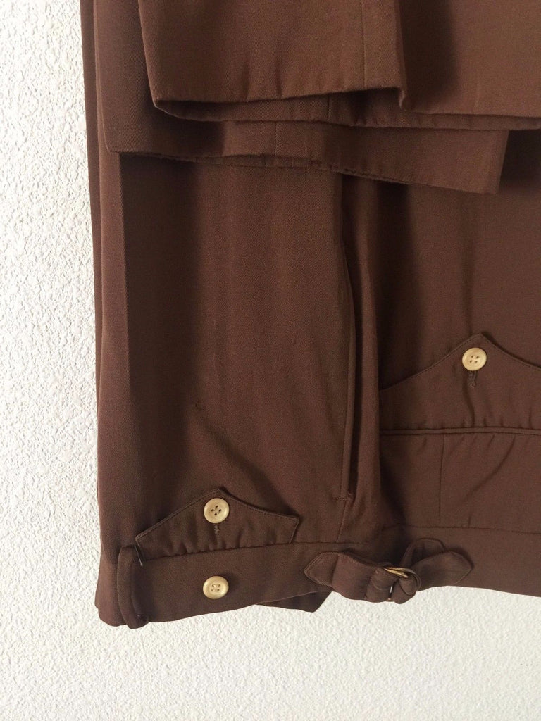 Original 1970s suit owned and worn by Rat Pack celebrity Dean Martin. Brown Ralph Lauren Polo suit, matching jacket and pants, tailored for Martin (hence no size labels.) Overall good condition, jacket excellent. Some minor chafing to seat of pants (see photo). Accompanied by a copied letter from the previous owner certifying that the clothes came from Dean Martin who gave them to his chauffeur after Martin's divorce in the 1970s. Martin appears to be wearing the suit in the final photo in this listing. |
