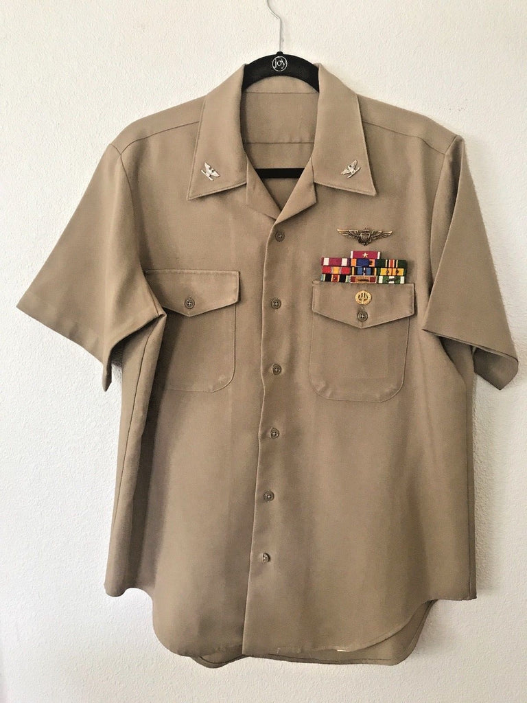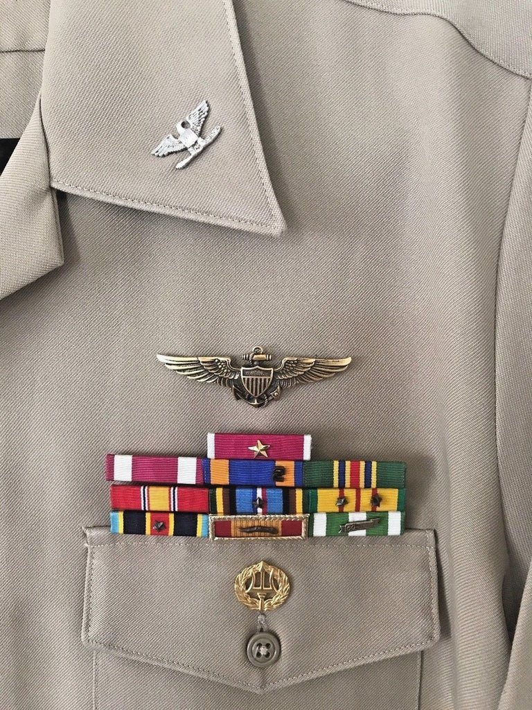 Shirt USN Captain's insignia on both collar tabs, Naval Aviator/Naval Flight Officer wings, and Command Ashore badge. 10 ribbons with numerous stars/clusters include Legion of Merit (with star), Meritorious Service Medal, Air Medal (with flight/strike device), Republic of Vietnam Gallantry Cross, etc.